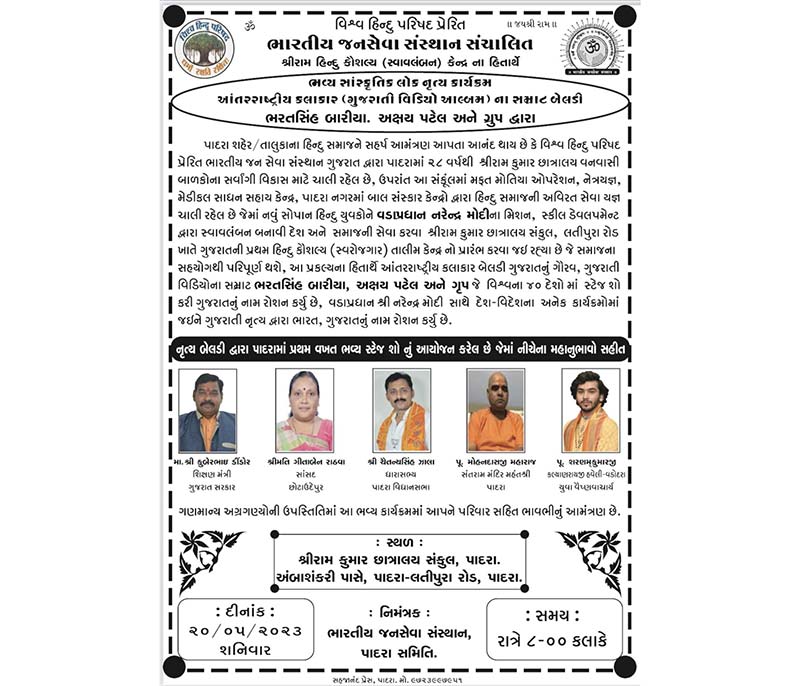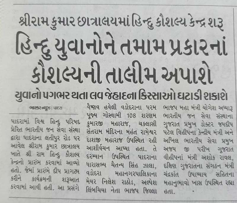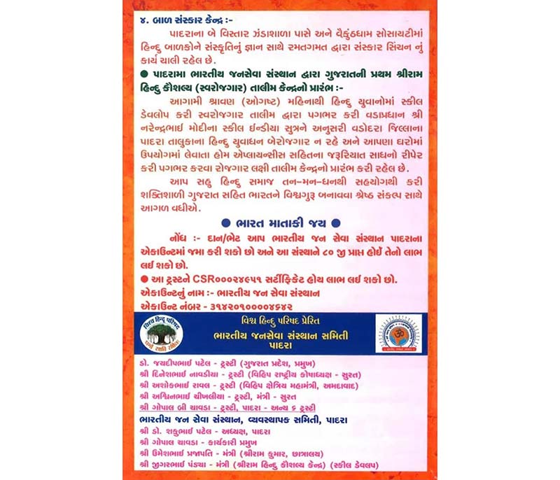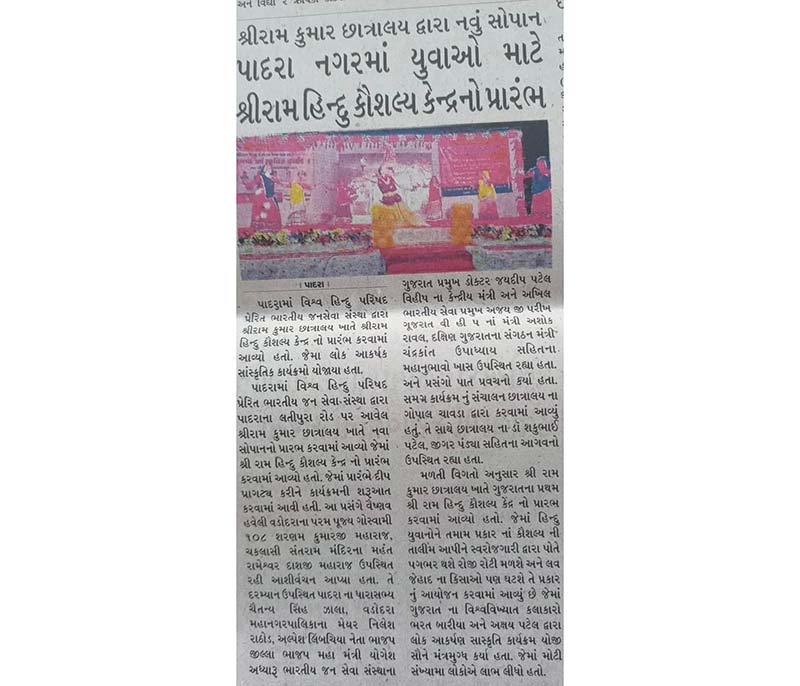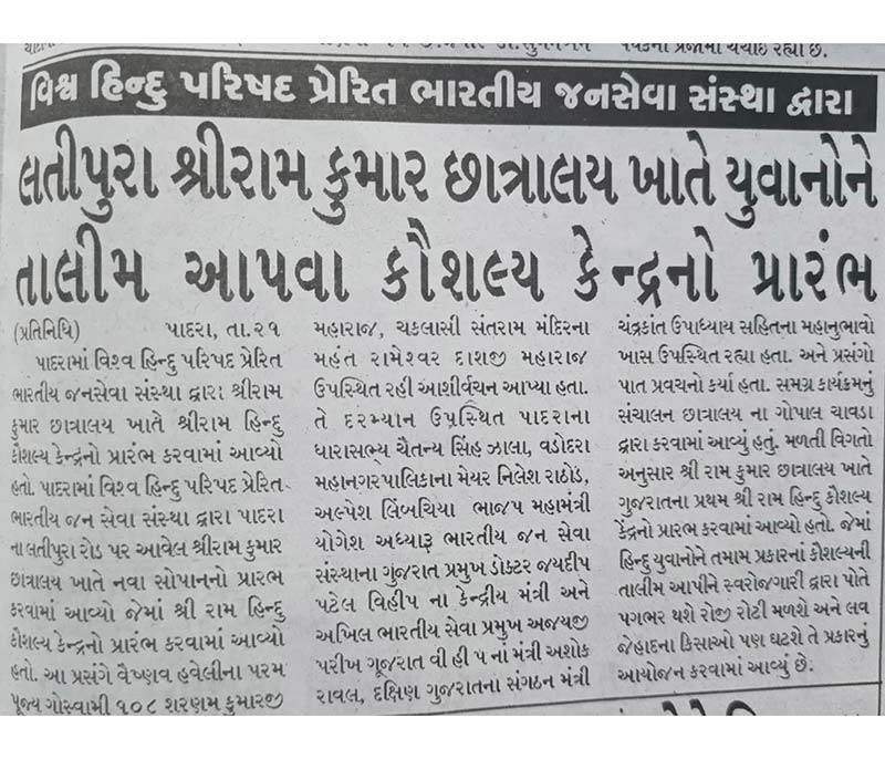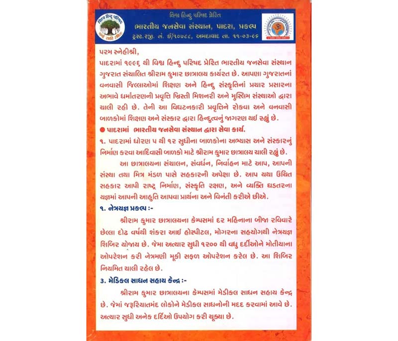 Since 1996 Vishwa Hindu Parishad inspired Indian Janaseva Sansthan Gujarat operated Shree Ram Kumar Hostel has been functioning in Param Snehishri, Padra. In the forest districts of our Gujarat, due to lack of education and propagation of Hindu culture, conversion activities are being carried out by Christian missionaries and Muslim organizations. To stop this destructive activity of his and to awaken Hindutva through education and rites among the forest children. 7 Service work by Indian Public Service Institution in Padra, Shree Ram Kumar Hostel for tribal children is running in Padra to build education and culture of children from class 5 to 12. Cooperation is expected from you, your organization and friends for the management, development and maintenance of this hostel. We pray and extend your due cooperation in nation building, culture protection, and personal development sacrifices.