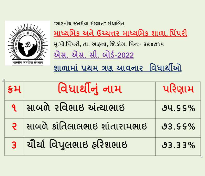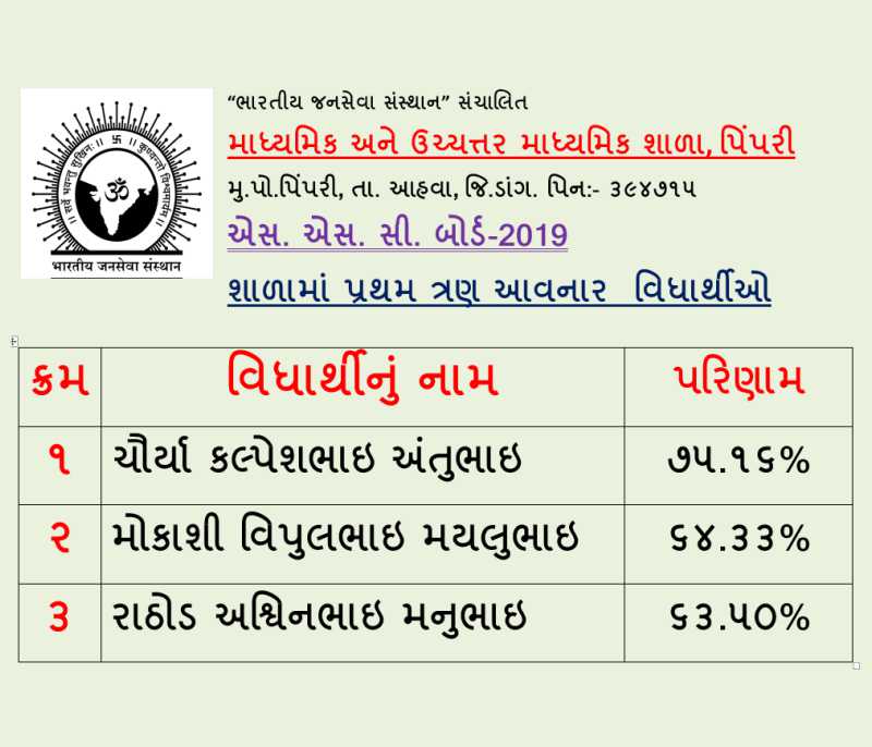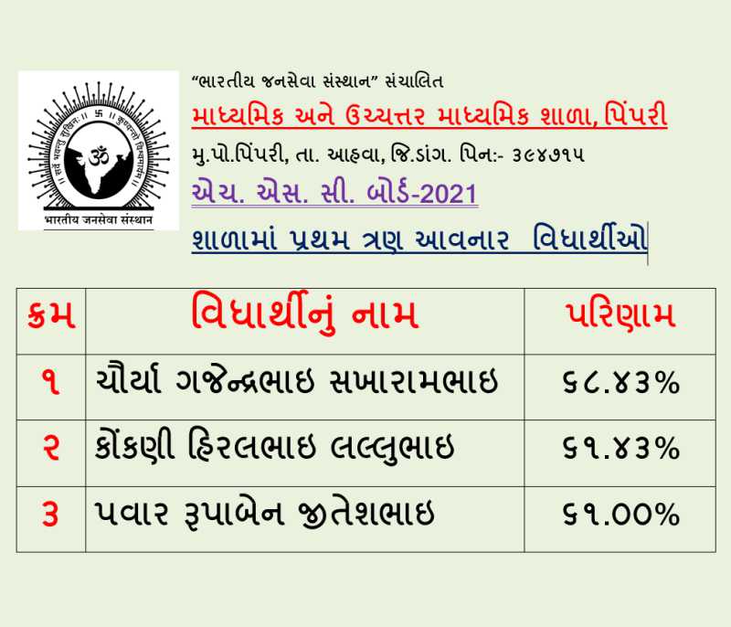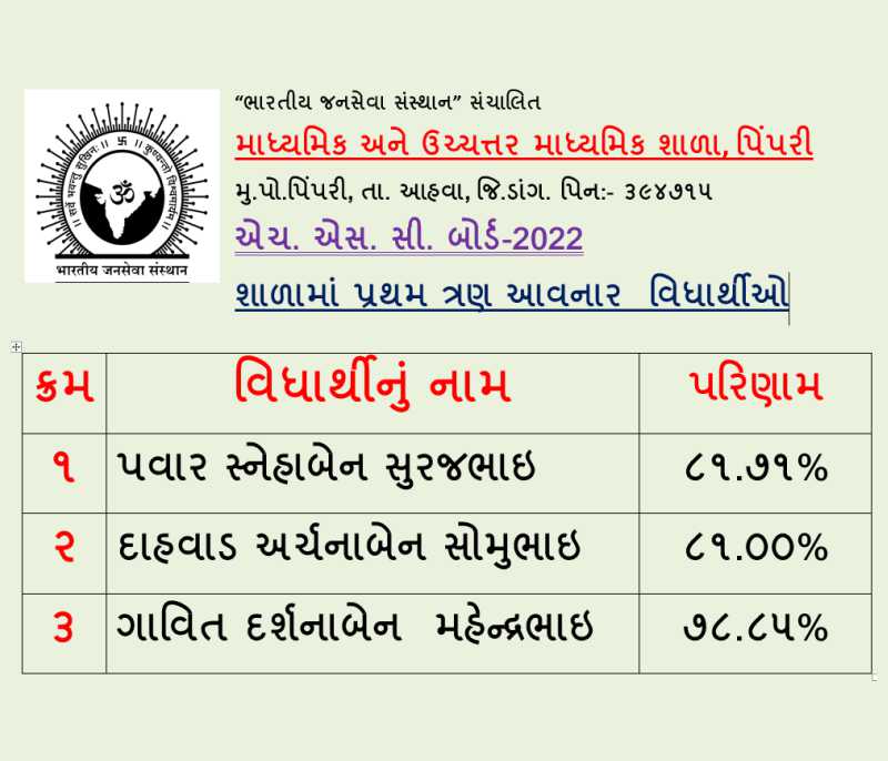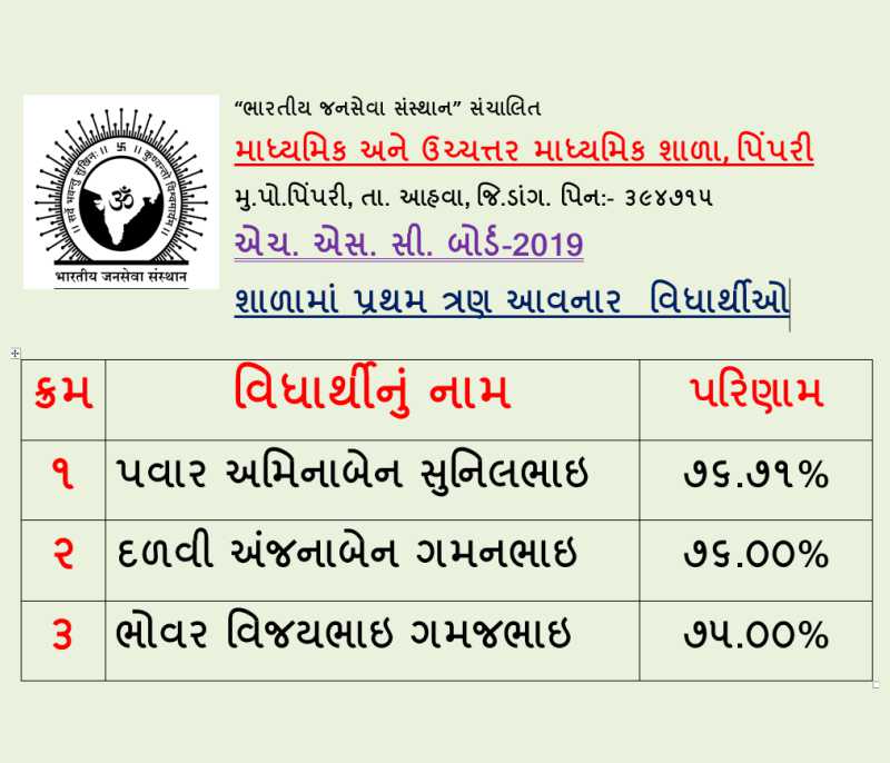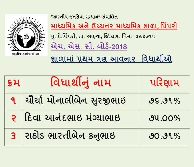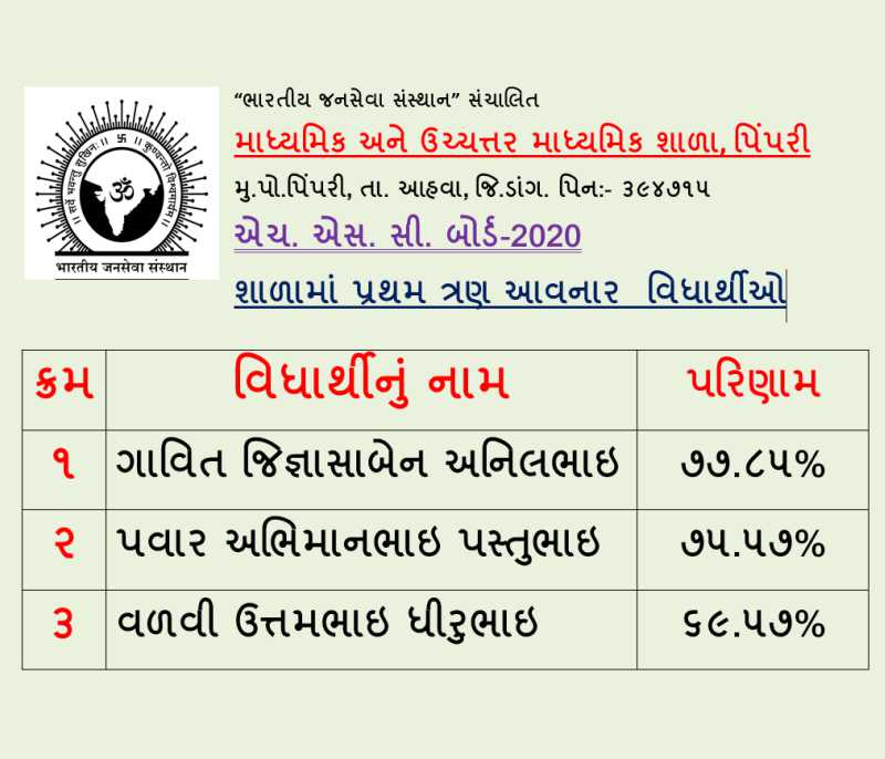 Secondary & Higher Secondary School Pimpari, is at a small village Pimpari, Ta. Ahwa, Dist. Dang. The school was established in the year 2005 since to till date the school provide free education to the tribal children as every children has right to educate. We also provide food, hostel facility, which is totally free and provided from the trust, namely Bhartiya Jansewa Sansthan Sanchalit. The school provide quality education with the Indian culture & ethics to the children. Our children are good at every activities and ranks in SSC & HSC Boards. Pimpari school have a 450 students and increases every year.